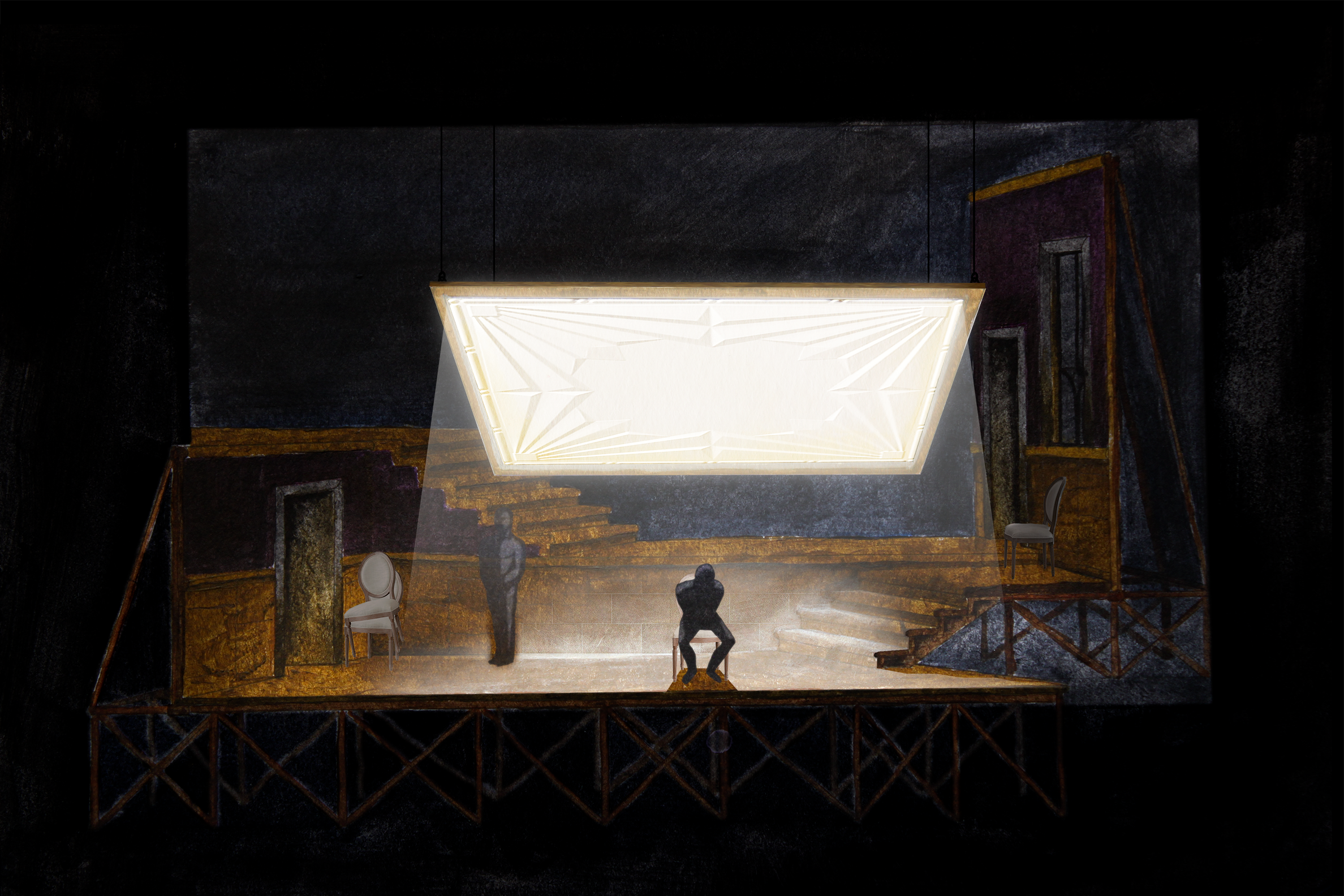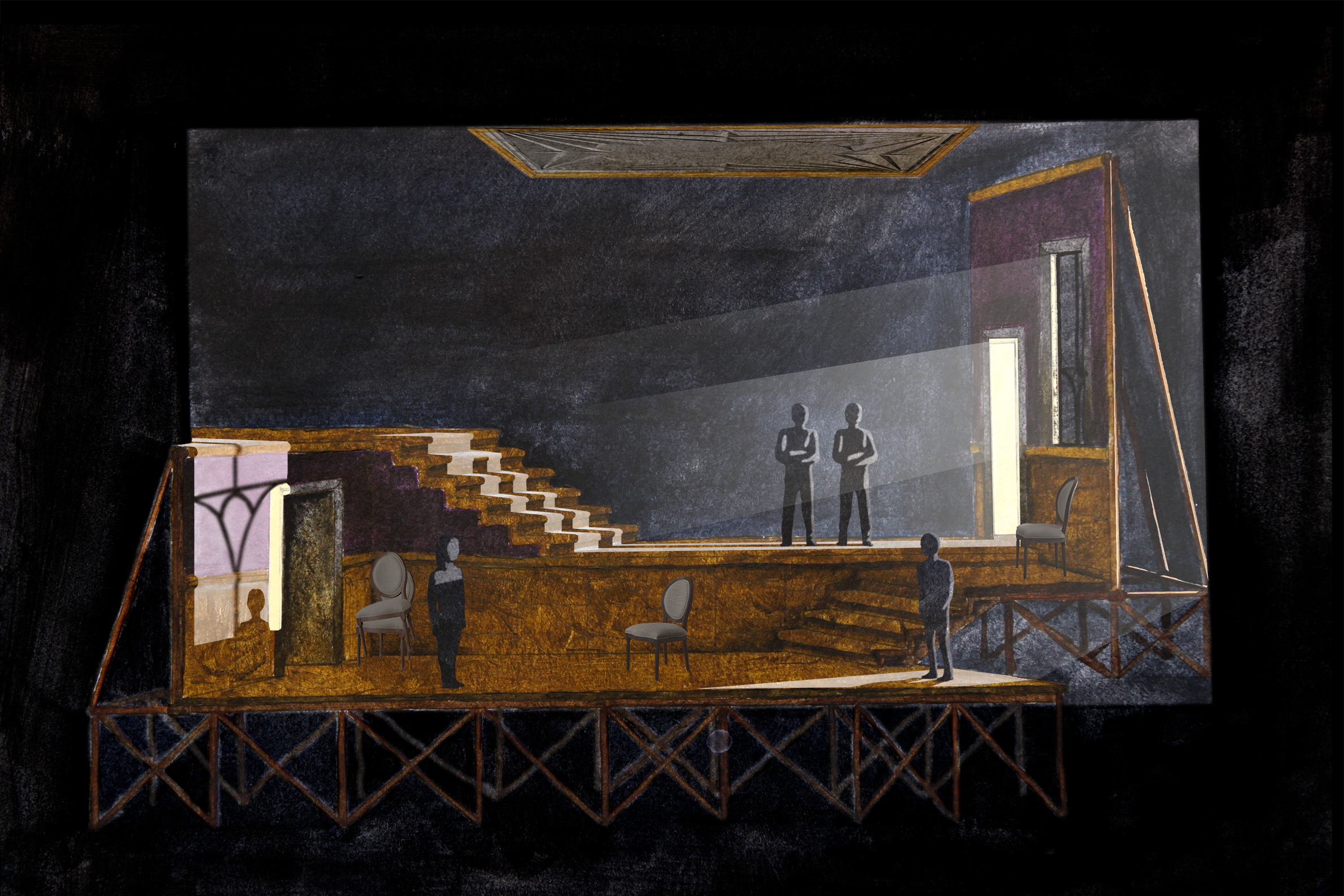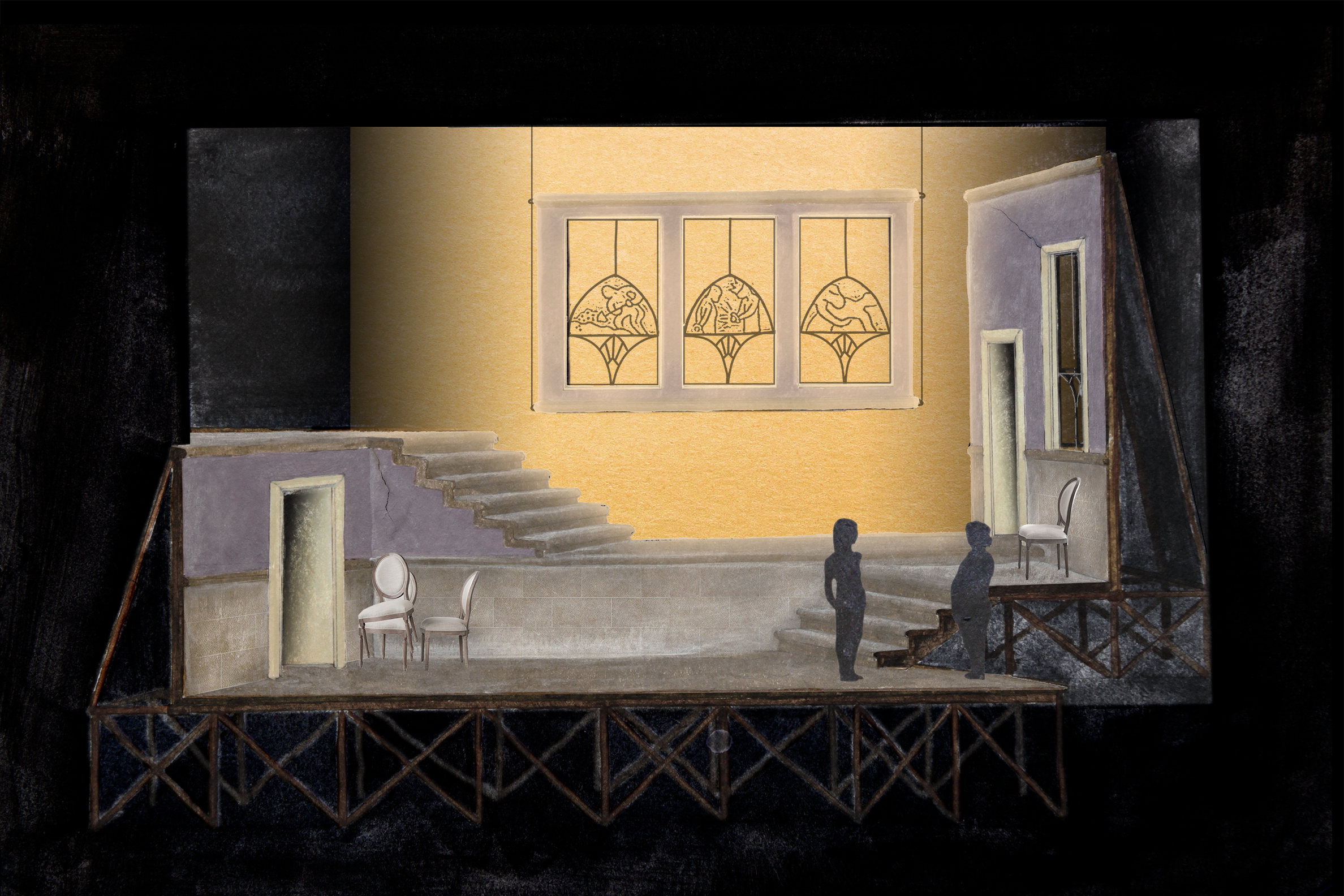 As far as furniture and moveable pieces, the set is relatively bare. A few banquet chairs are the major props, nonchalantly thrown in the corner when not in use, evoking a bygone era when the palace was full of people and love and all the chairs would be needed.