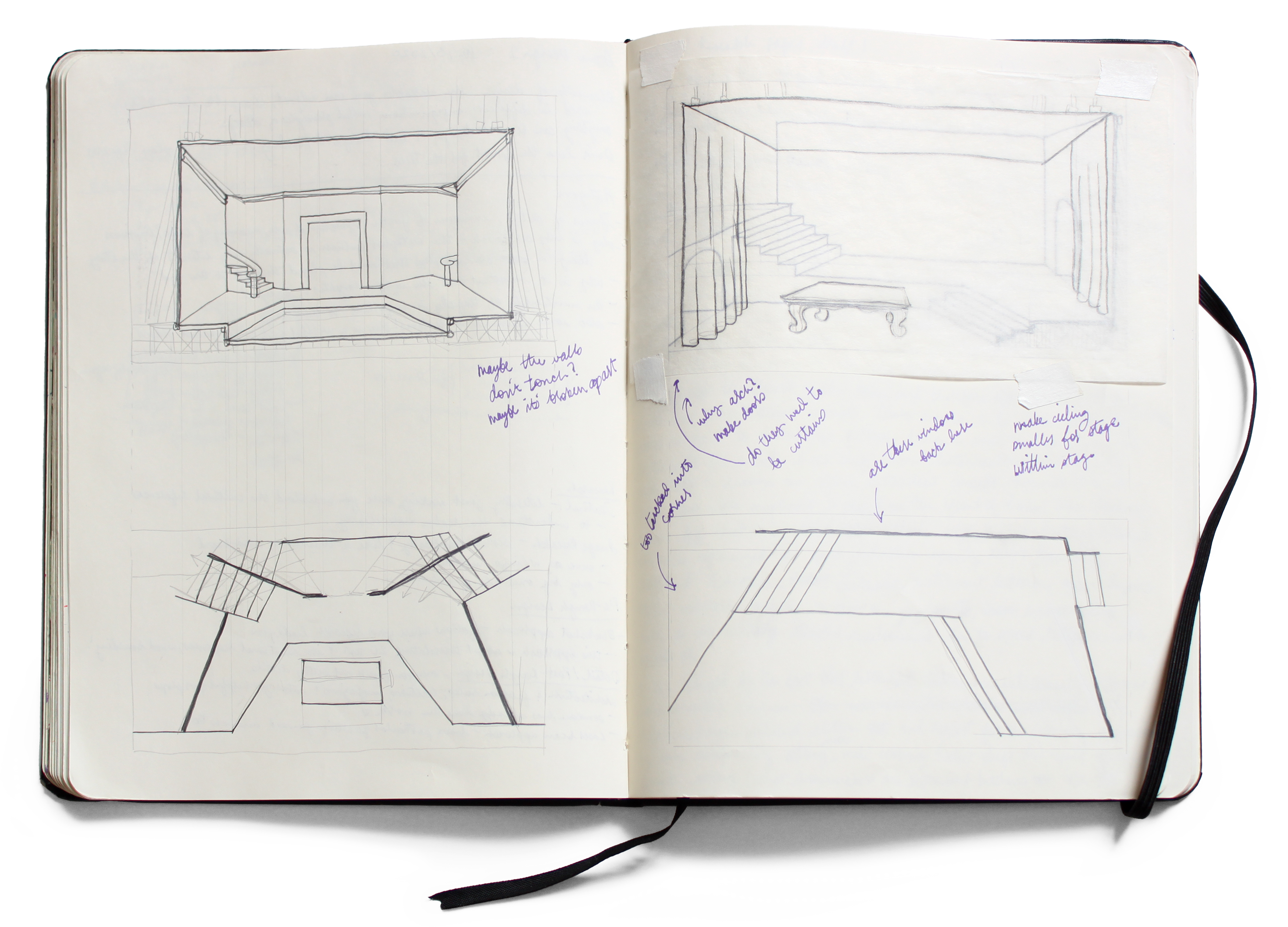 The final plan, though similar to the sketch in the bottom right, ultimately scraps the curtains in favor of a moveable ceiling piece and cast iron window frames to differentiate moods.