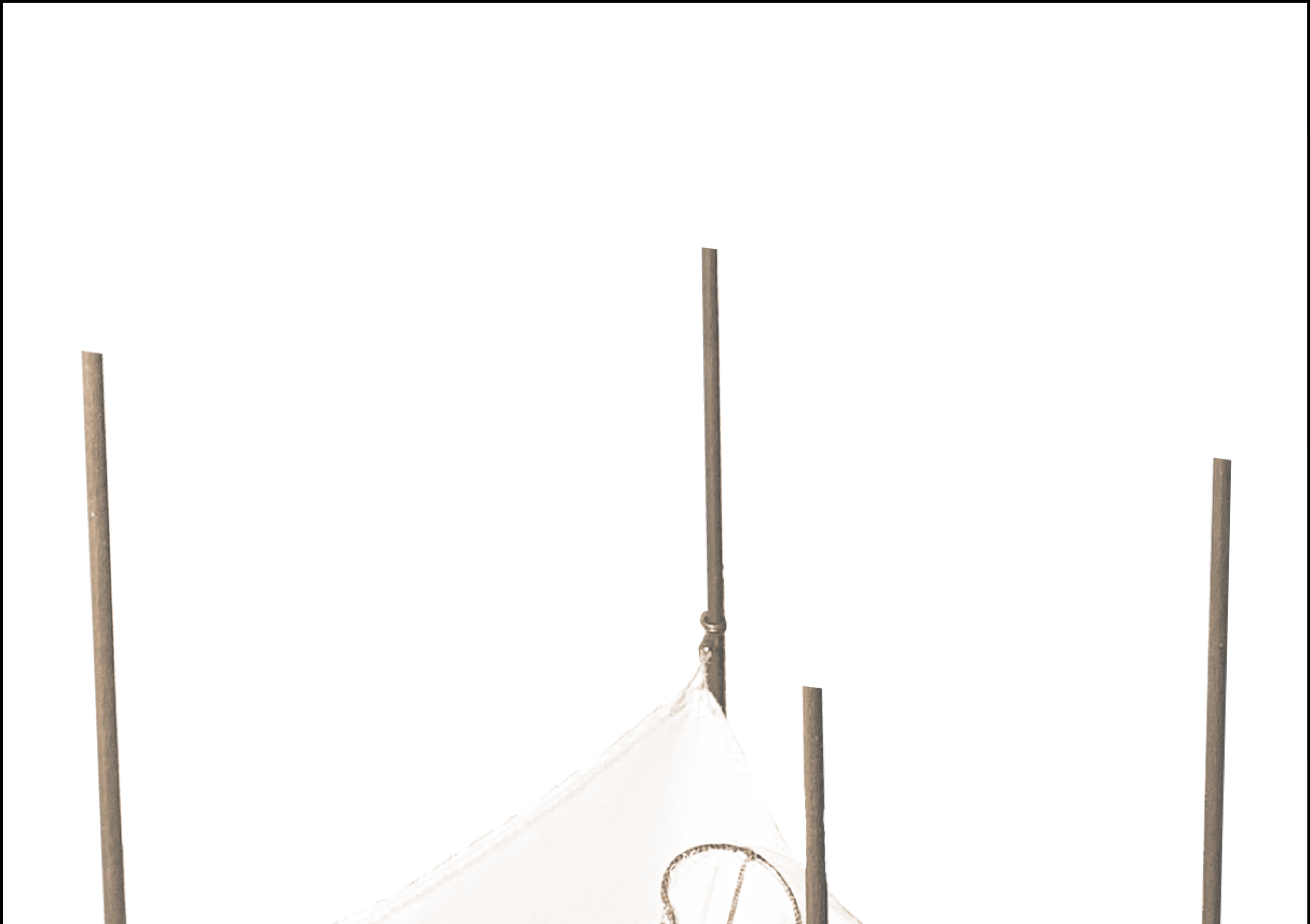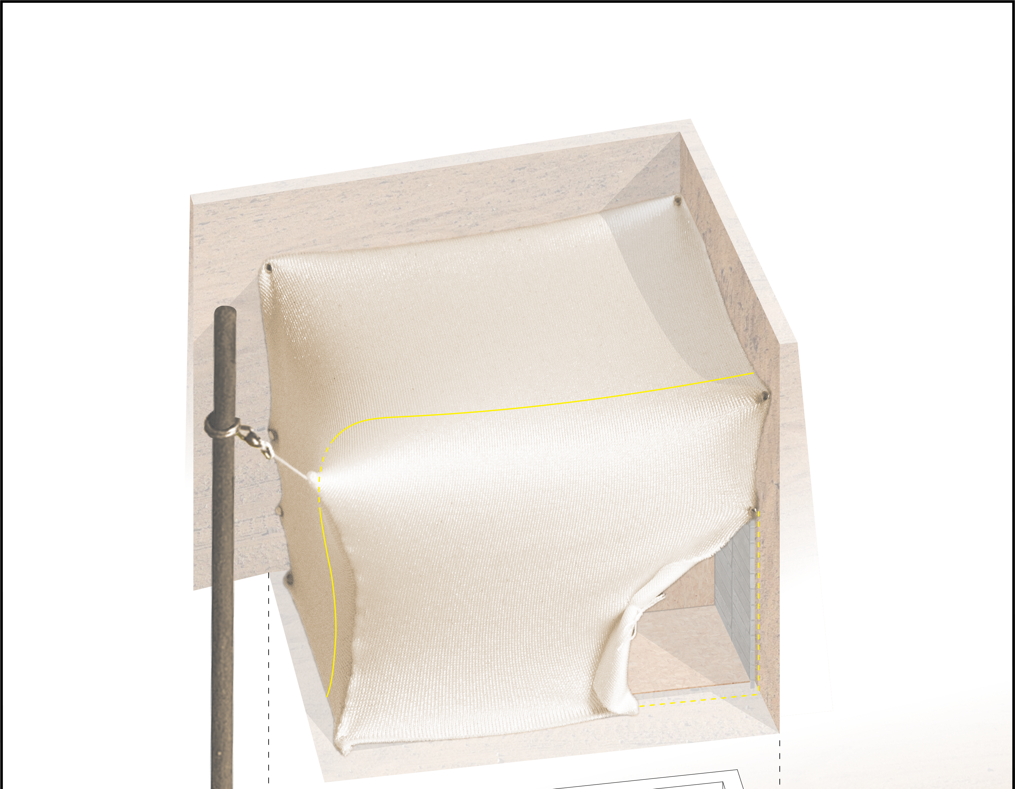 The hybrid drawing, which features a hand-sewn and soldered physical model, depicts one of the staging areas and its canopy. The stair down to the restrooms encircles another post.