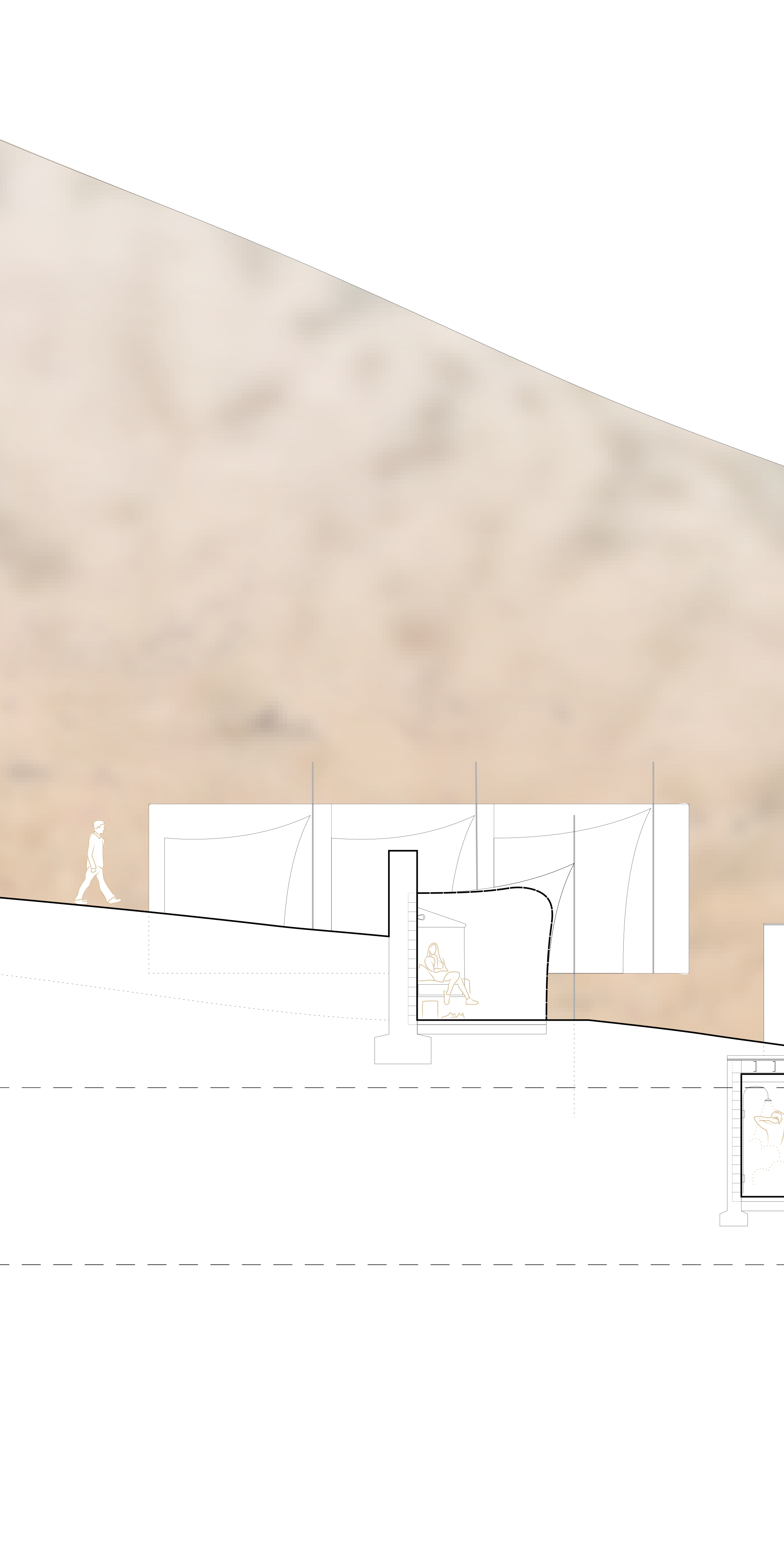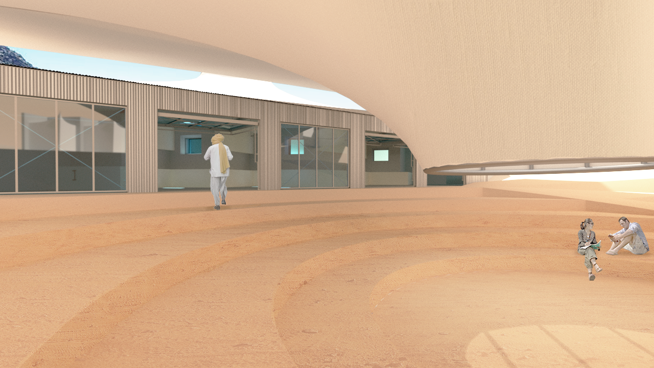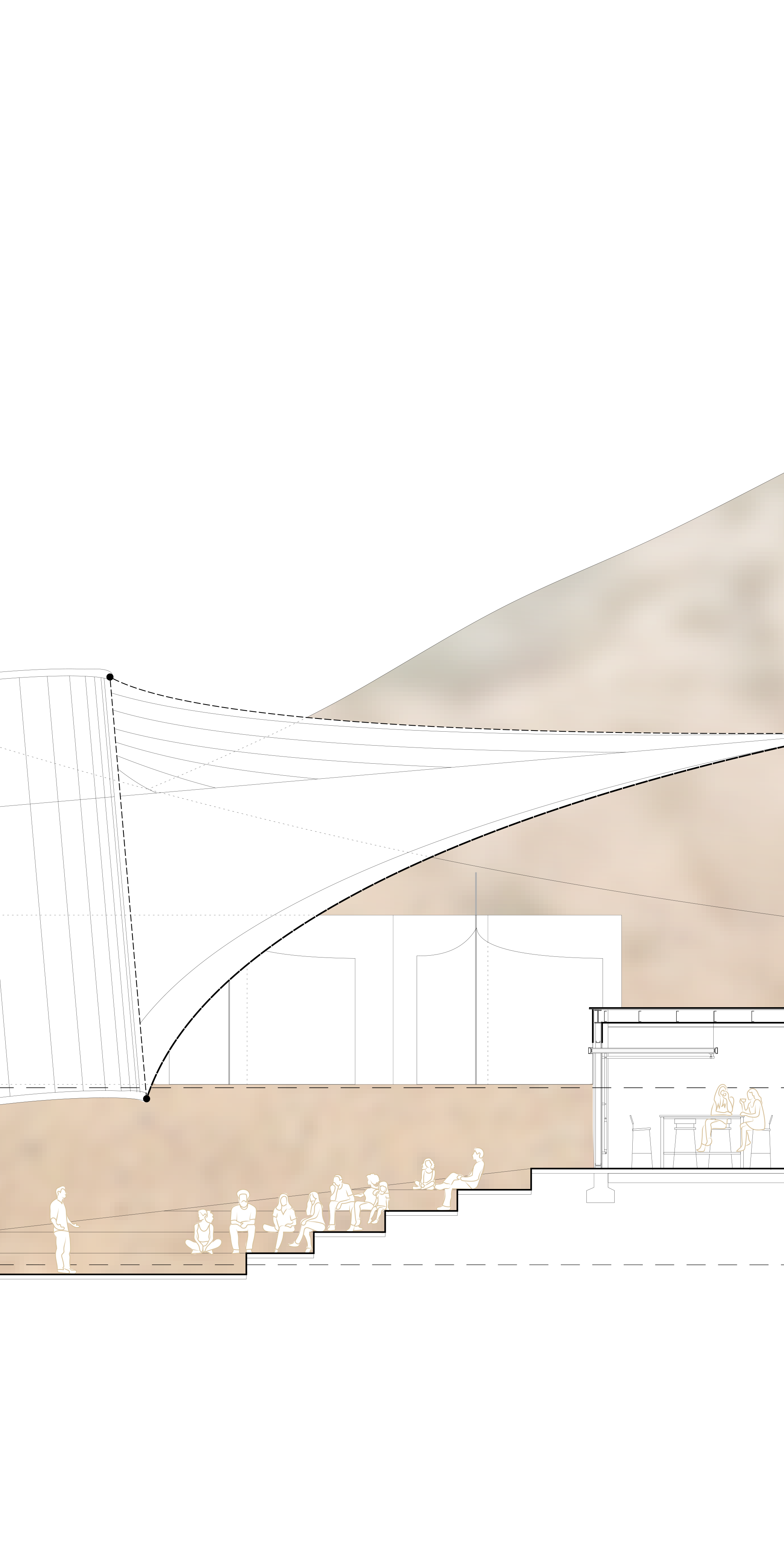 The program is split into two “staging areas” - the amphitheatre to the north and the workshop to the south. Both are protected from the scorching Arizona sun by canopies, around which the individual living units are organized.