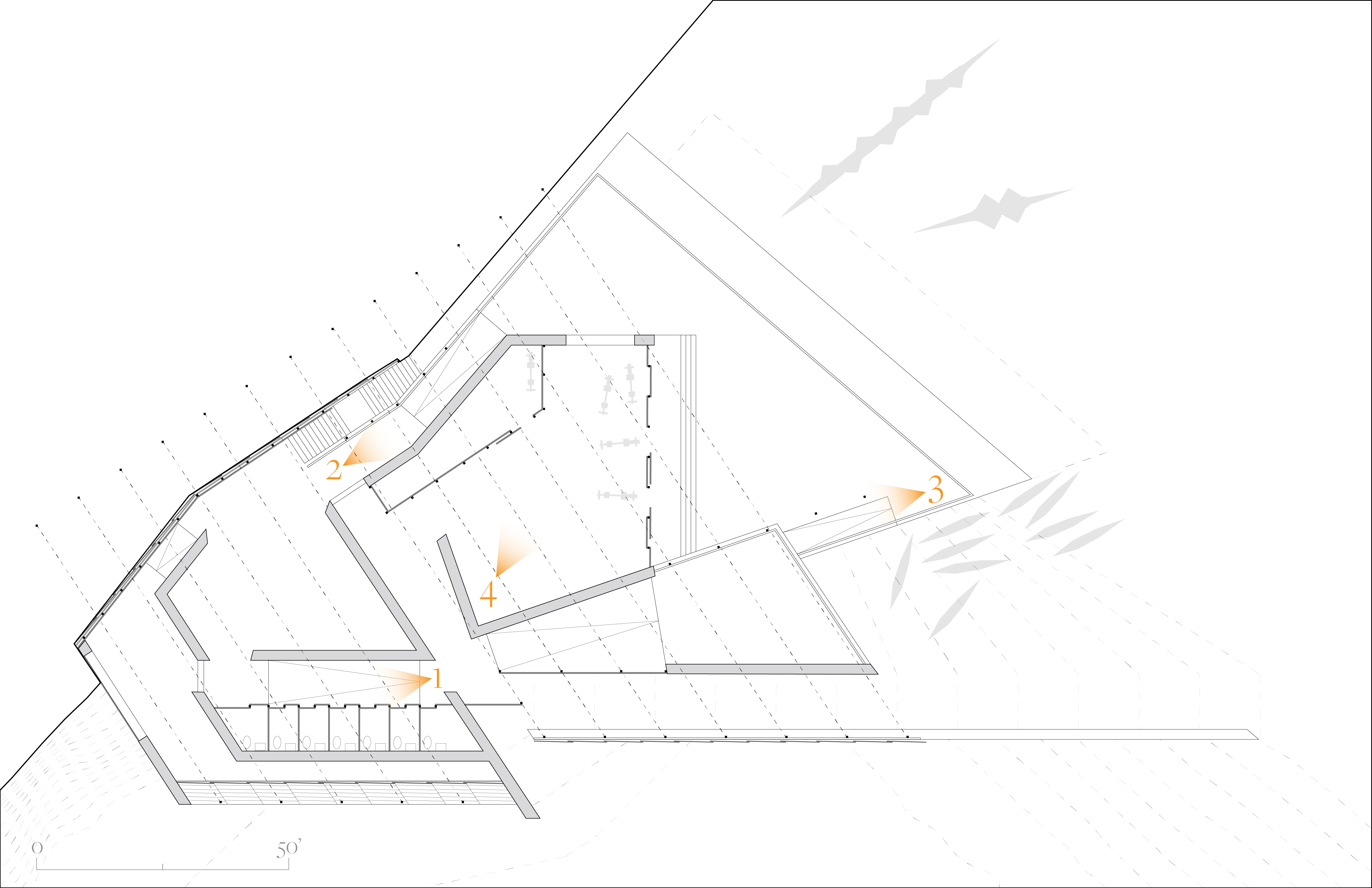 One enters on the south side of the building of the upper floor, which houses flexible spaces to meet the shifting needs of a nature center. The main entrance drops one into the most compressed inner space, near the bathrooms (1). Visitors continue out into the light of the upper deck with a view out over Ford Lake (2) before turning back into the depths of the boat storage. A long ramp descends to another compressed space: the boat garage, which opens out onto the dock at water level. The lower level also includes extra showers/changing areas for rowing teams.
