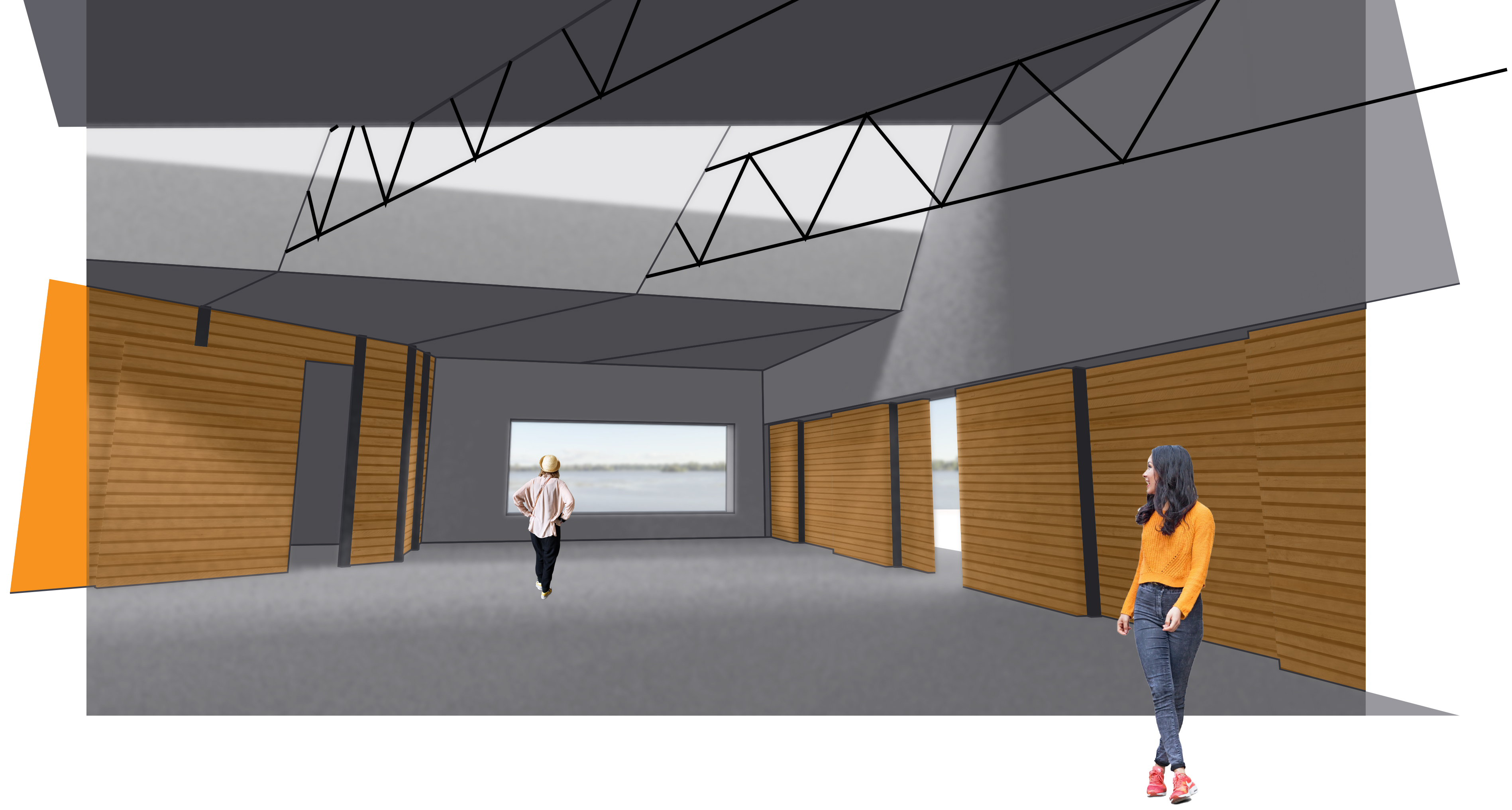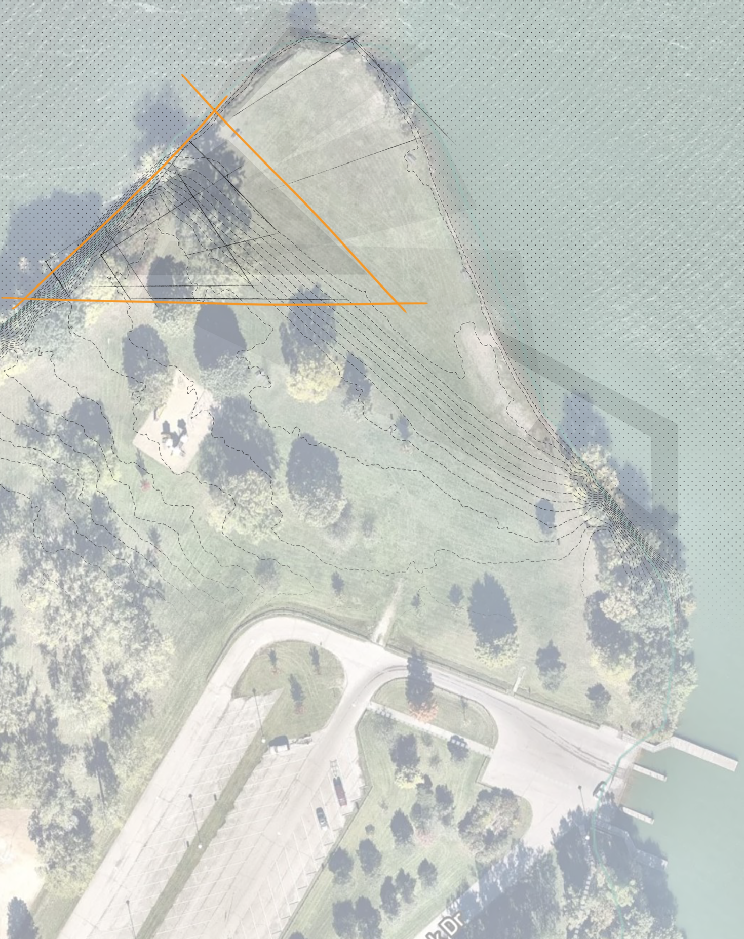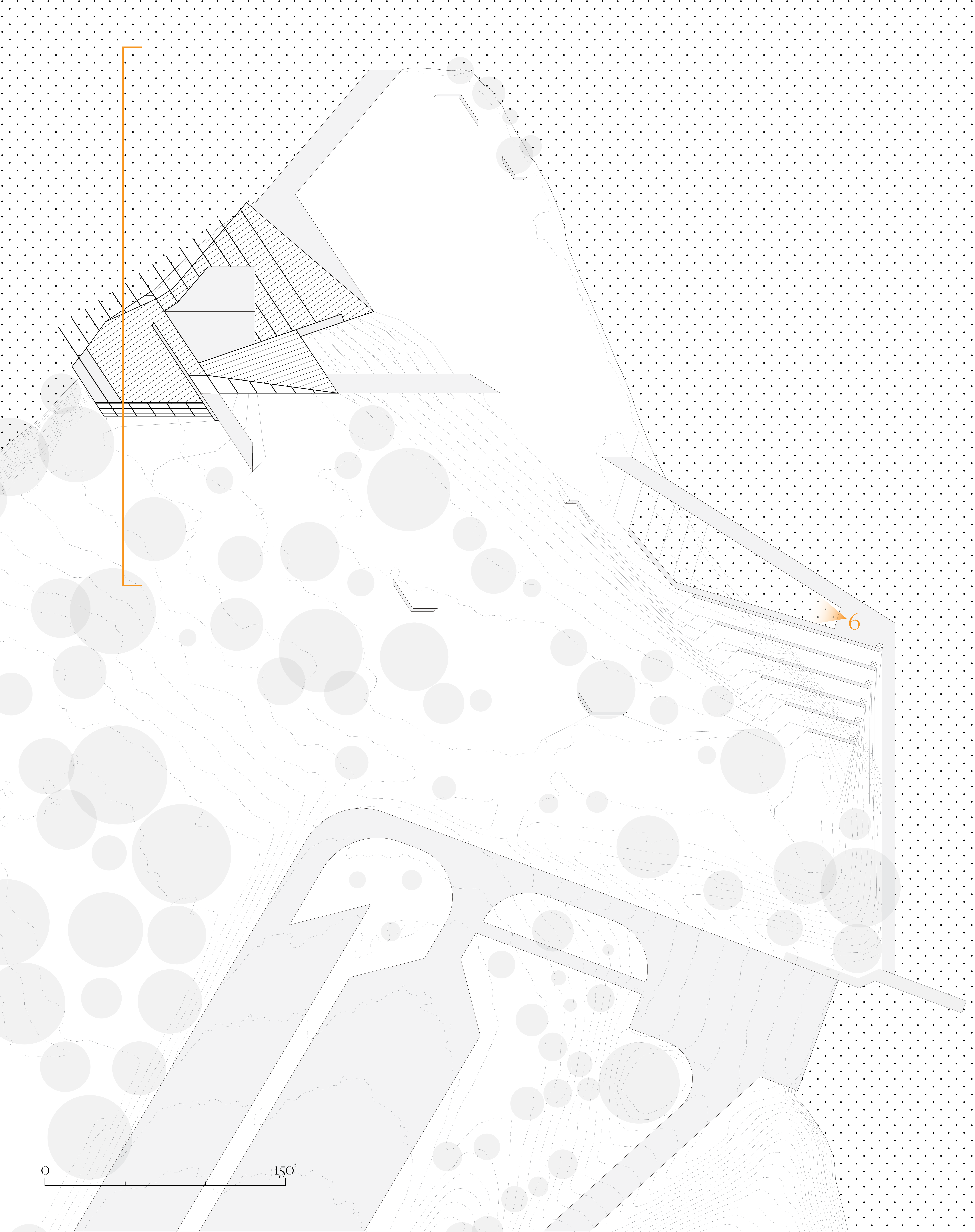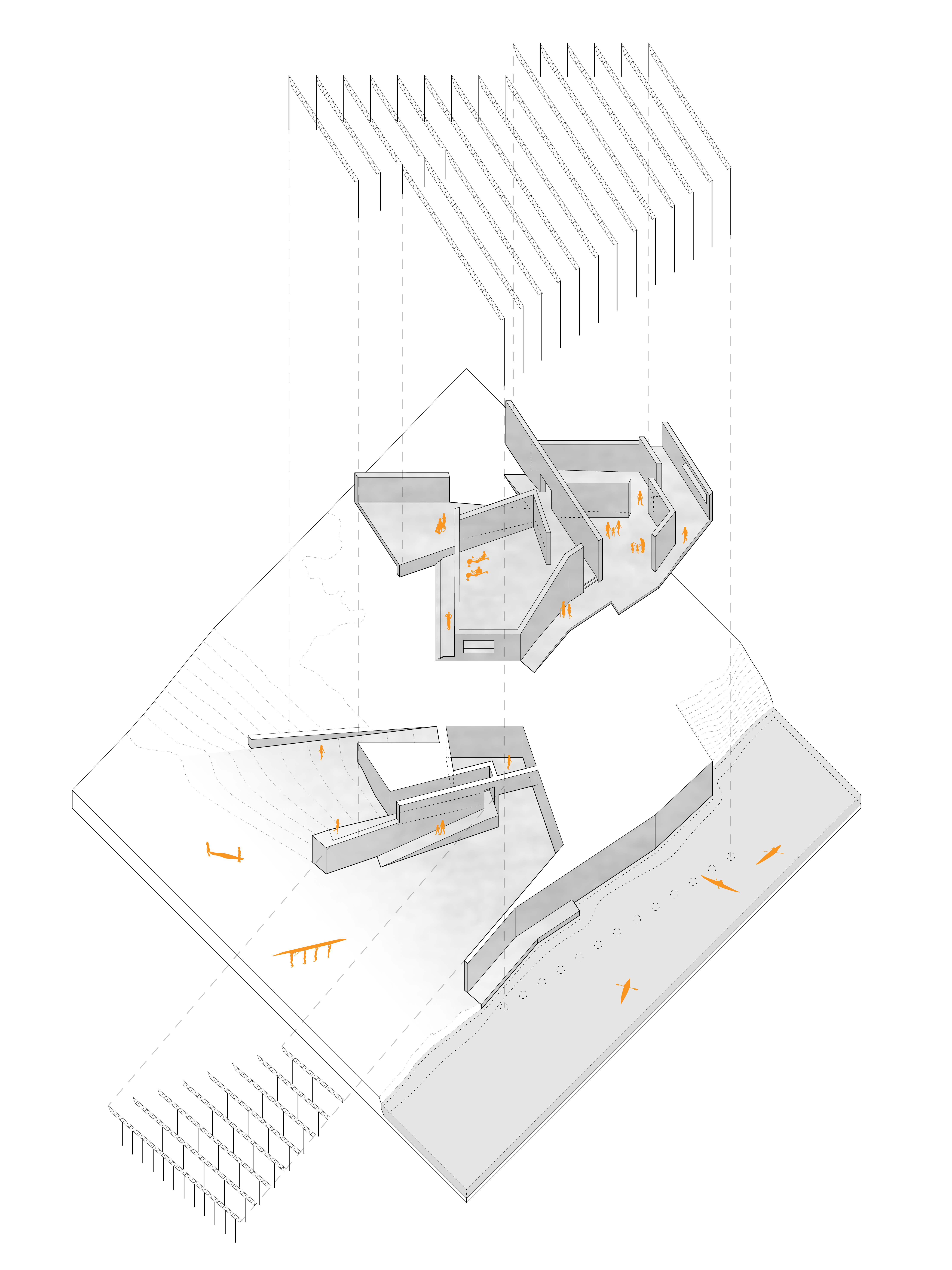 Situated within Ypsilanti’s Ford Lake Park, this hypothetical project seeks to bring visitors across different layers of threshold as they navigate from the entrance on the upper floor, to the bathrooms and changing areas, to the boat storage area.