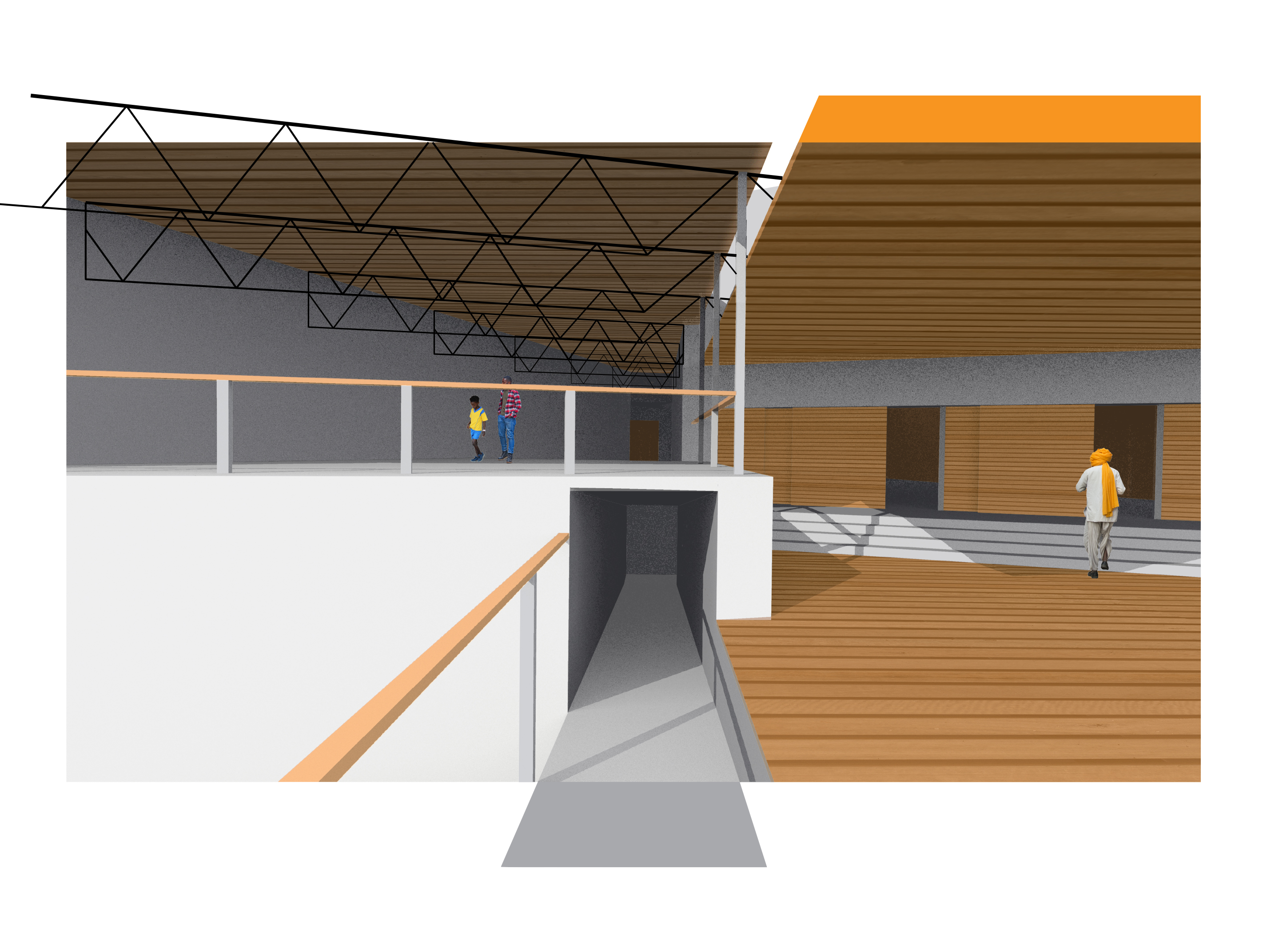 The different thresholds are signaled by the layers of construction. The stereotomic spaces are molded with rammed earth where feasible and emulated with plaster in the main hall ceiling (see persp. 4). The lightest, techtonic construction is built up with wood and steel members and the wooden decking conceals or reveals the truss system (see persp. 3).