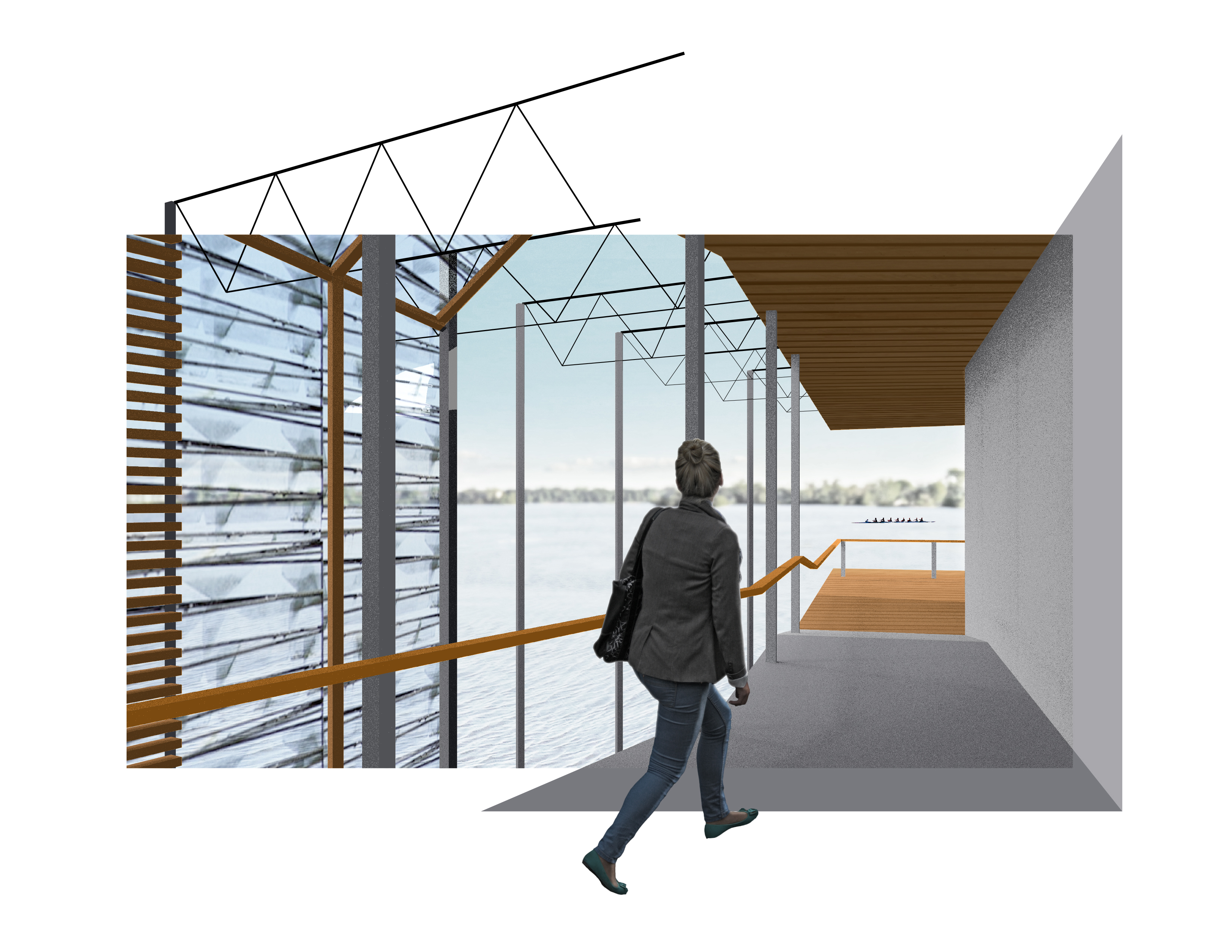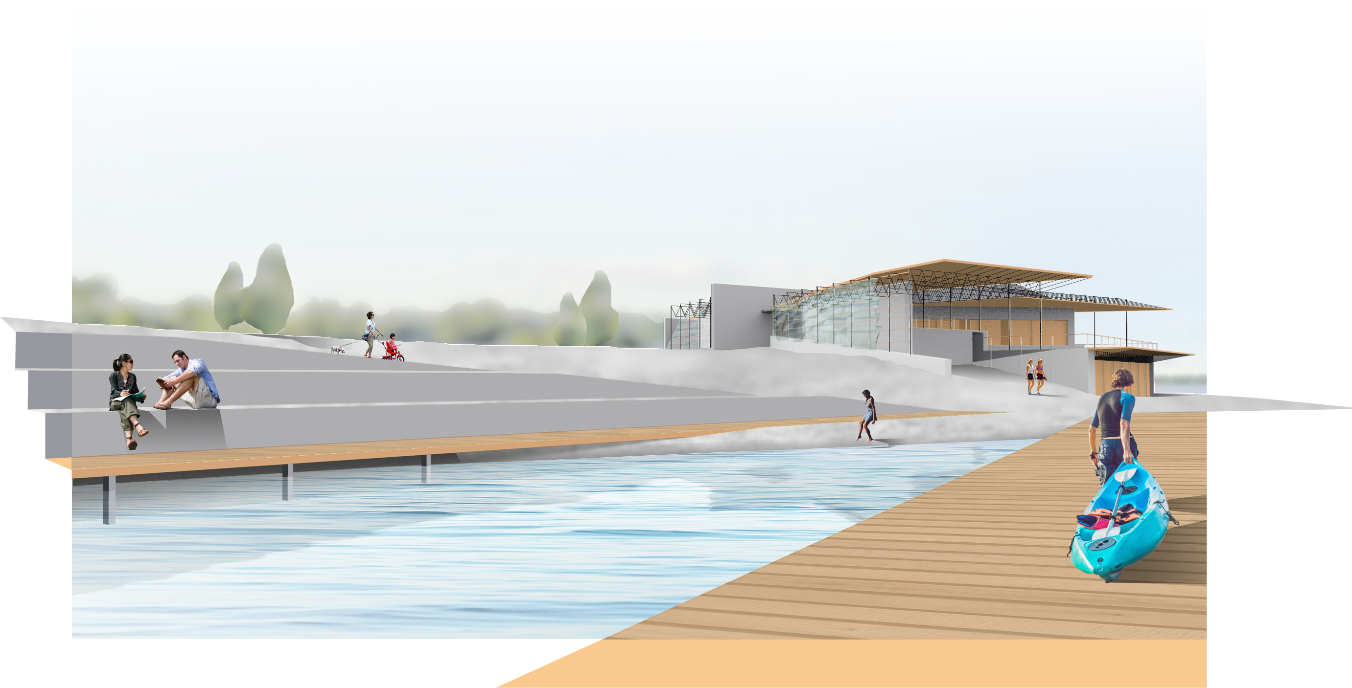 The architecture has the capacity to service rowing teams and host regattas, but is also intended for recreational paddlers and community groups. The rough wedge geometry created by the shoreline, the hill, and the southern facing wall explodes into different zones for different demographics.
