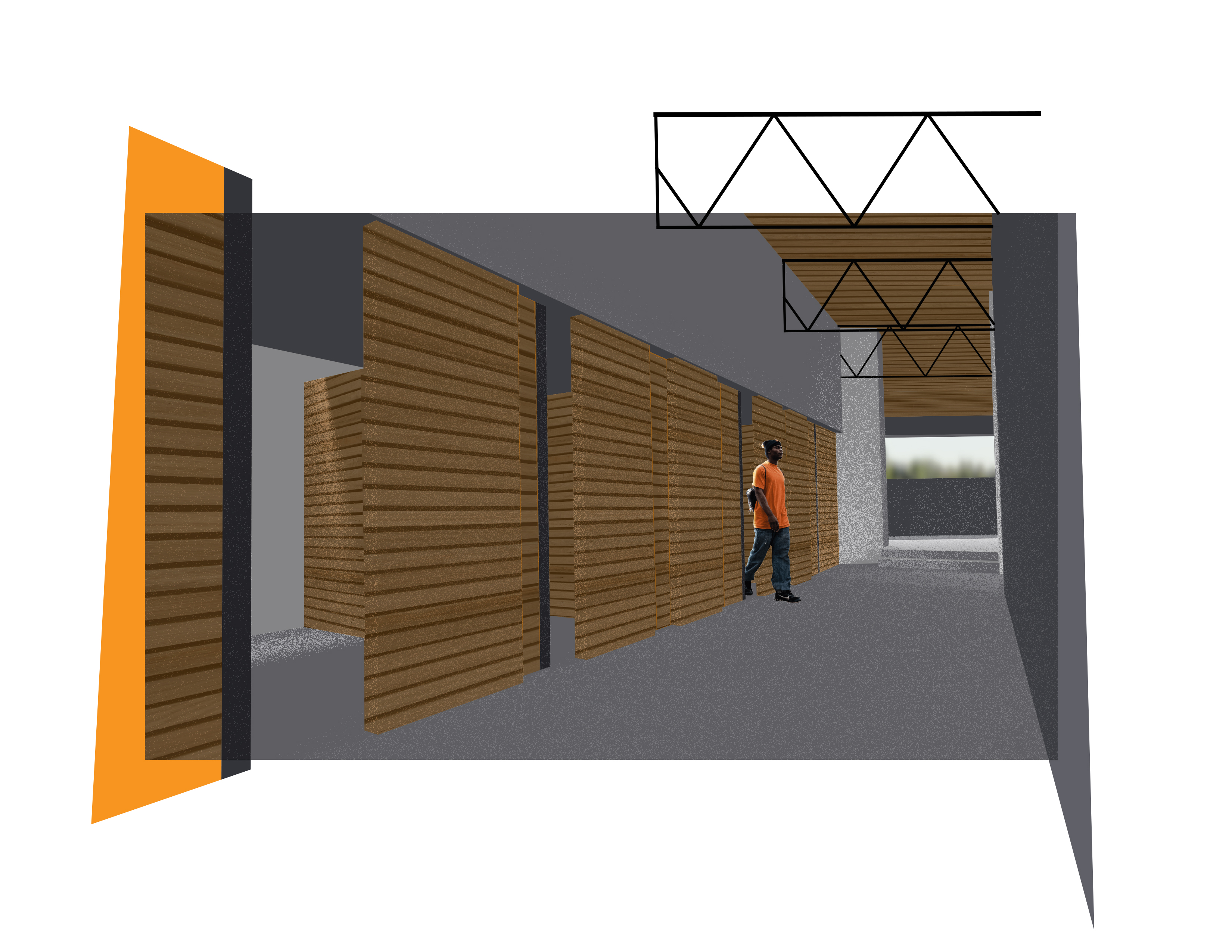 Finally, a shell of glass paneling encloses the project. The rough studies below and the layering concept illustrated in the section and perspectives are inspired by multiPlan arhitekti’s Rowing Center in Bled, Slovakia, Marie-José Van Hee and Robbrecht en Daem’s Market Hall in Ghent, Belgium, and Rural Studio’s Glass Chapel in Mason’s Bend, AL.